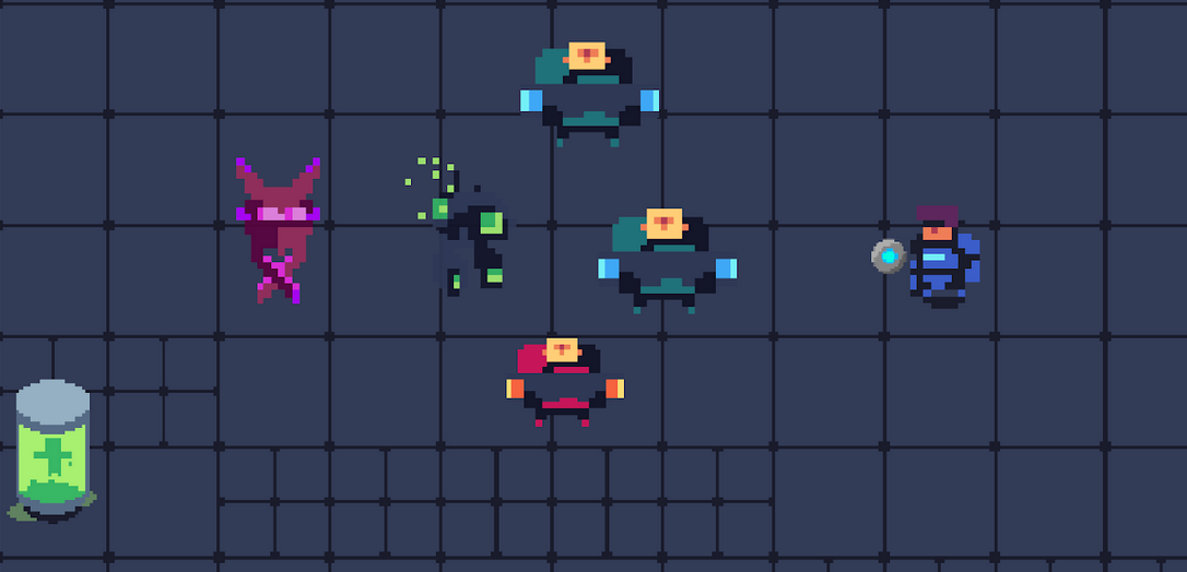 Lab Rat is a top down, 2D shooter game where the player fights their way through a laboratory full of robots. The player can synchronize with the robots, utilizing a rhythm minigame, to gain a variety of buffs if they succeed.